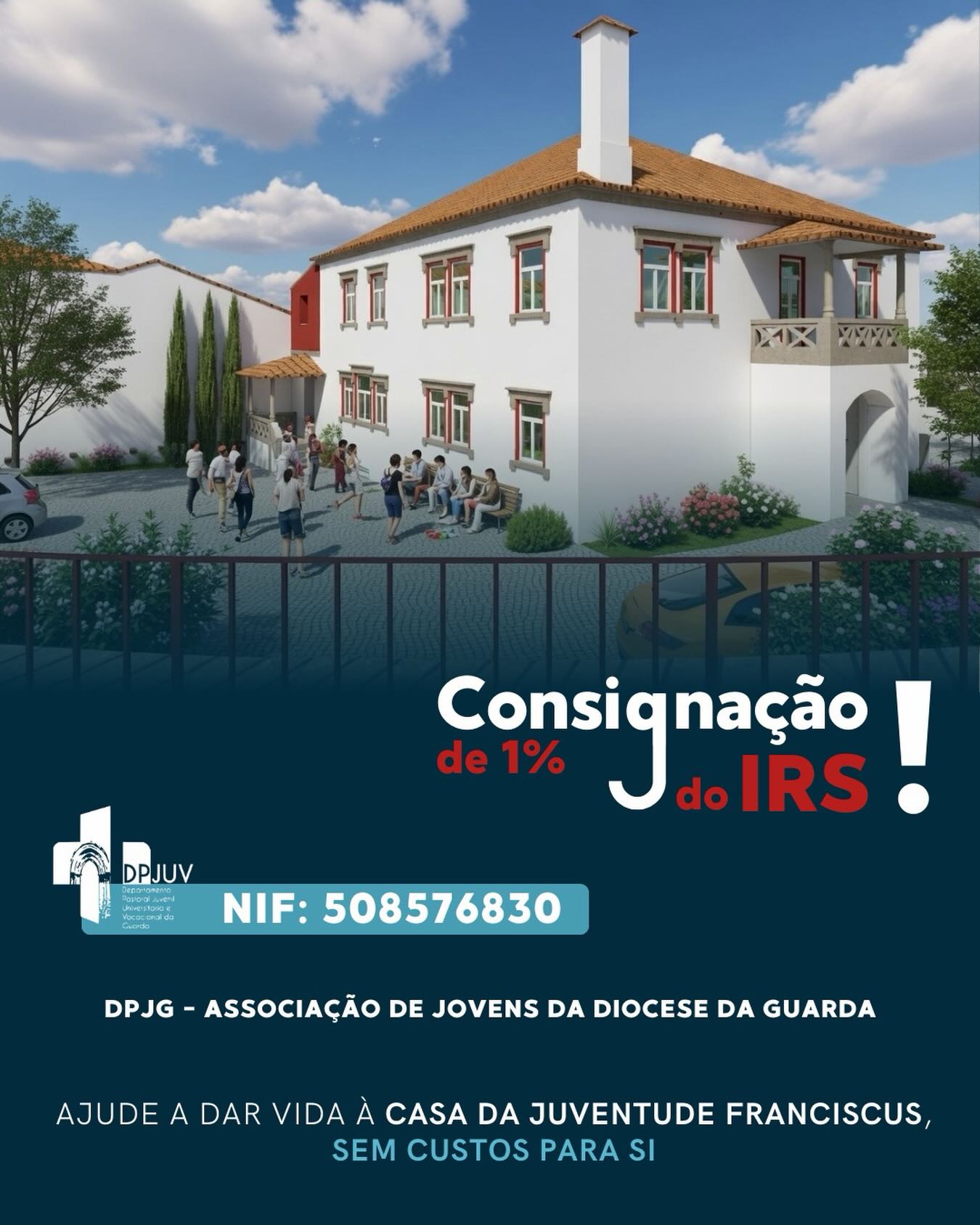 Sabendo que existem muitas Instituições que assim podem ser apoiadas, no presente ano, o Departamento da Juventude da nossa Diocese convida à consignação do IRS à DPJG – Associação de Jovens da Diocese da Guarda (NIF 508 576 830), contribuindo assim para a requalificação da Casa da Juventude “Franciscus”.